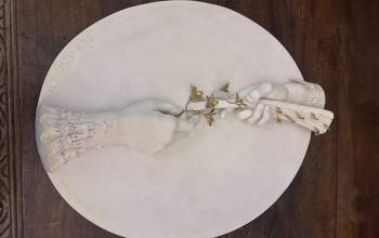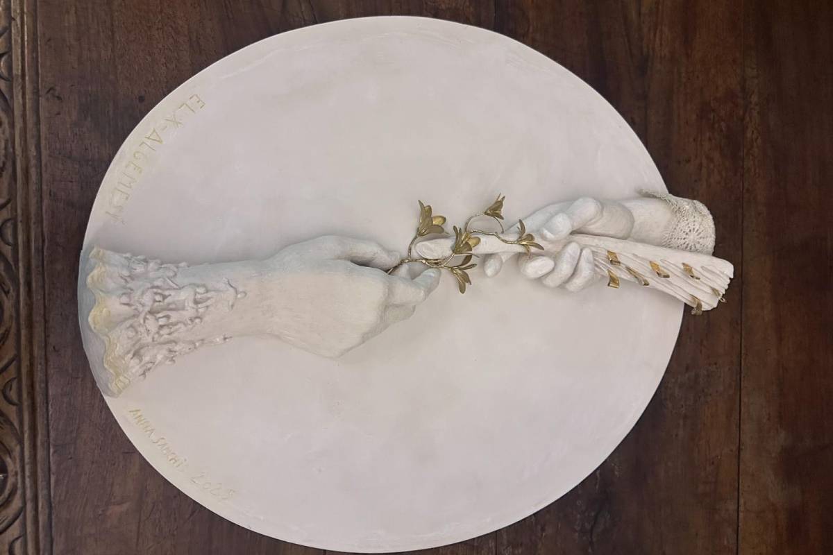 Por su parte, el Patronat de la Festa de la Mare de Déu de la Salut obsequió al Misteri d’Elx con una pieza creada expresamente para la ocasión, en la que dos manos de escayola entrelazadas simbolizan el apoyo entre ambas devociones: la mano que porta la palma del Misteri d’Elx tendiendo la suya a la Mare de Déu de la Salut de Algemesí, mientras que la Muixeranga, representada en la base, evoca al pueblo levantándose del barro tras la adversidad.